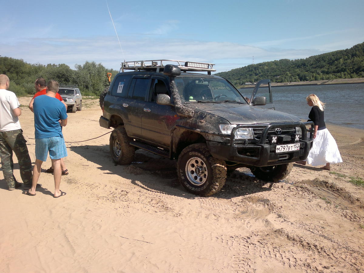 В 8. 00 открываю форум нашего нижегородского клуба и вижу баннер с просьбой о помощи. Застрял человек в черте города, провалился в песок - колеса заехал помыть. Сидит со вчерашнего вечера. Мы его тянули в 2 лебедки - не двигается. Пытался дергать - никак. В итоге поднимали манипулятором за каждое колесо подкладывали бревна и вытянули камазом.