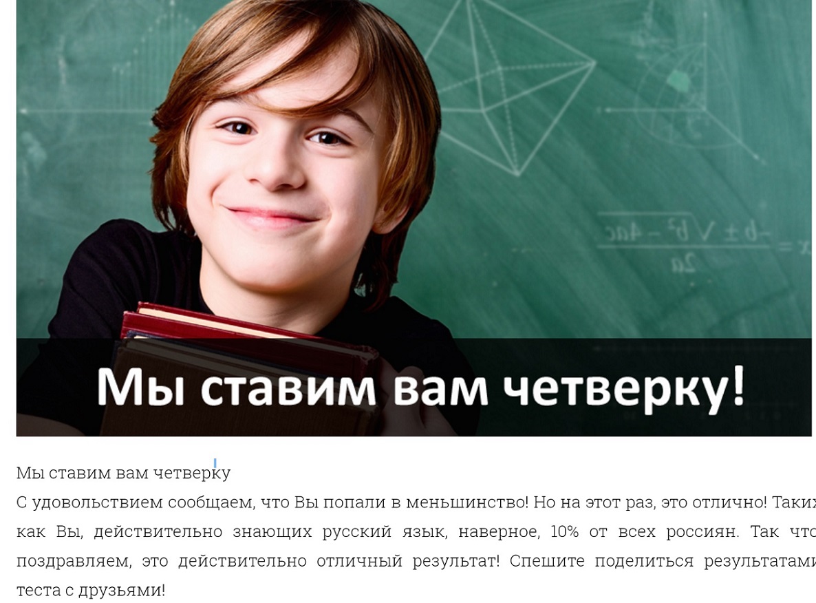 С удовольствием сообщаем, что Вы попали в меньшинство! Но на этот раз, это отлично! Таких как Вы, действительно знающих русский язык, наверное, 10% от всех россиян. Так что, поздравляем, это действительно отличный результат! Спешите поделиться результатами теста с друзьями!