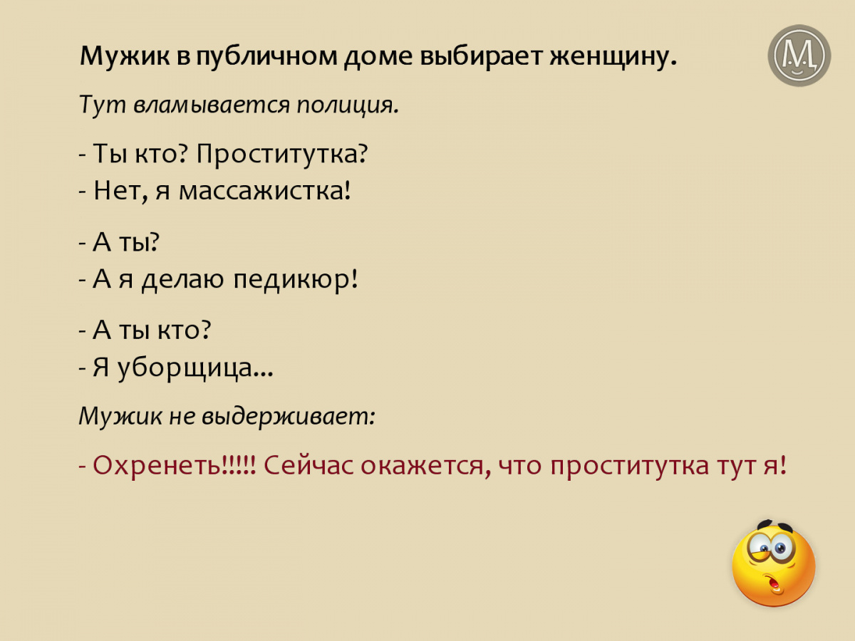 ни за что не ляжет спать, не переспав с женой". Утром: "А моя покойная бабушка...",
